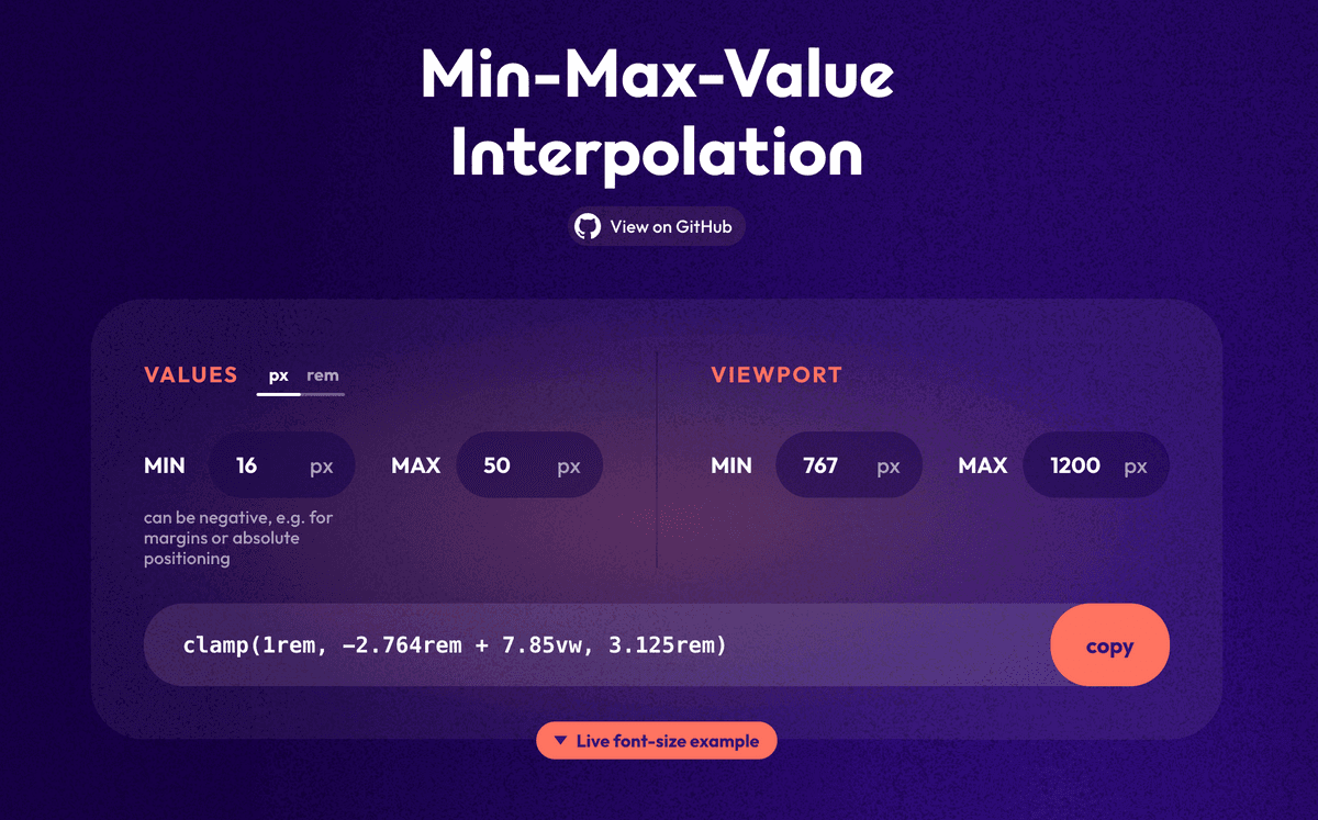 ビューポートサイズと実際の値を入れるだけでclamp()で使う値を計算してくれるツール。