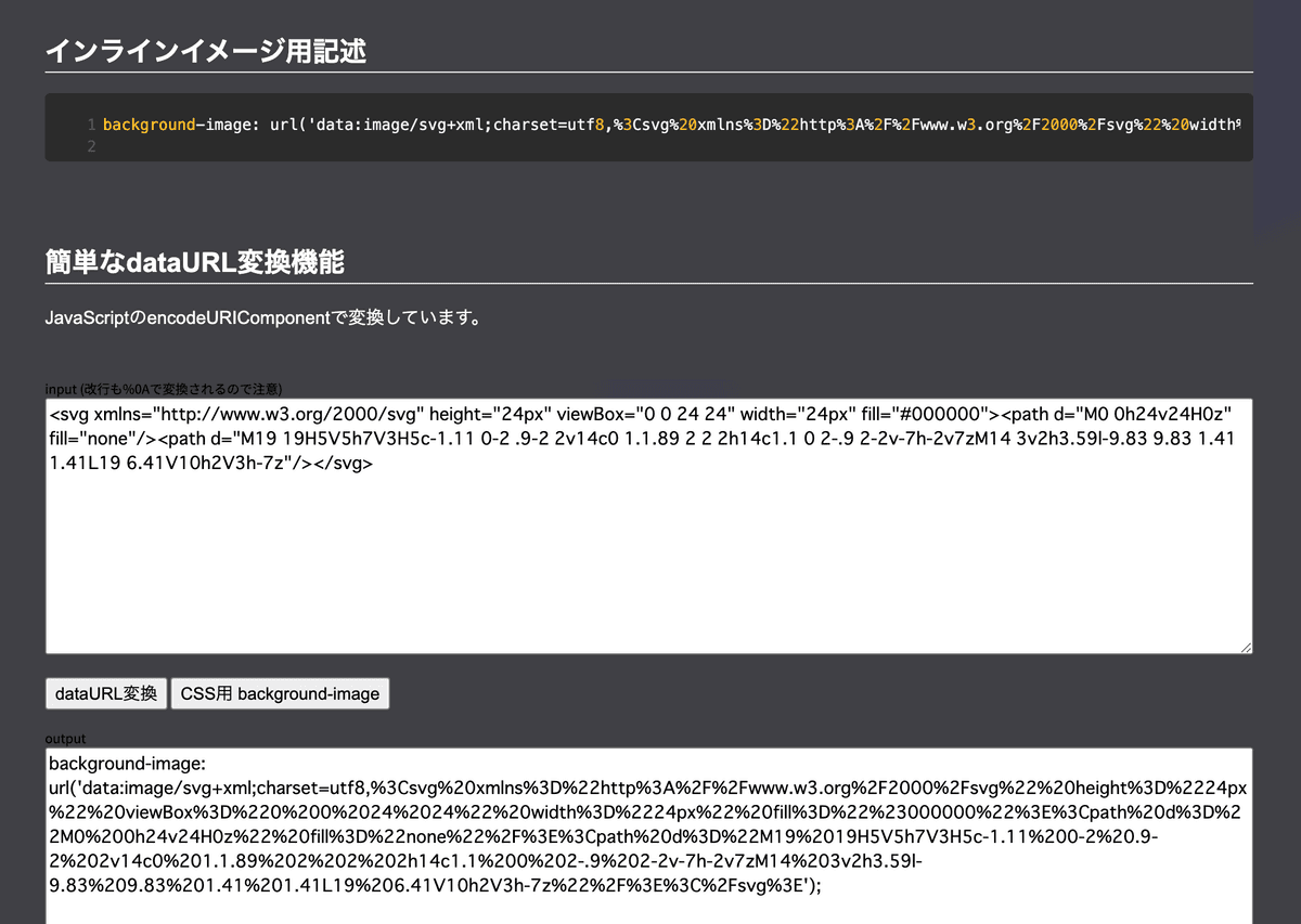 SVGをdataURL形式に変換できるツール。