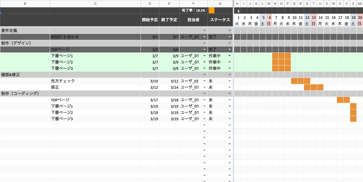 スプレッドシートで作られたガントチャート。日付を入れるとカレンダーに自動反映されるからとても便利!